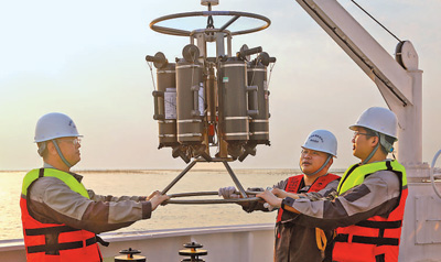 連云港市環(huán)境監(jiān)測(cè)監(jiān)控中心工作人員在采集海水樣品。
