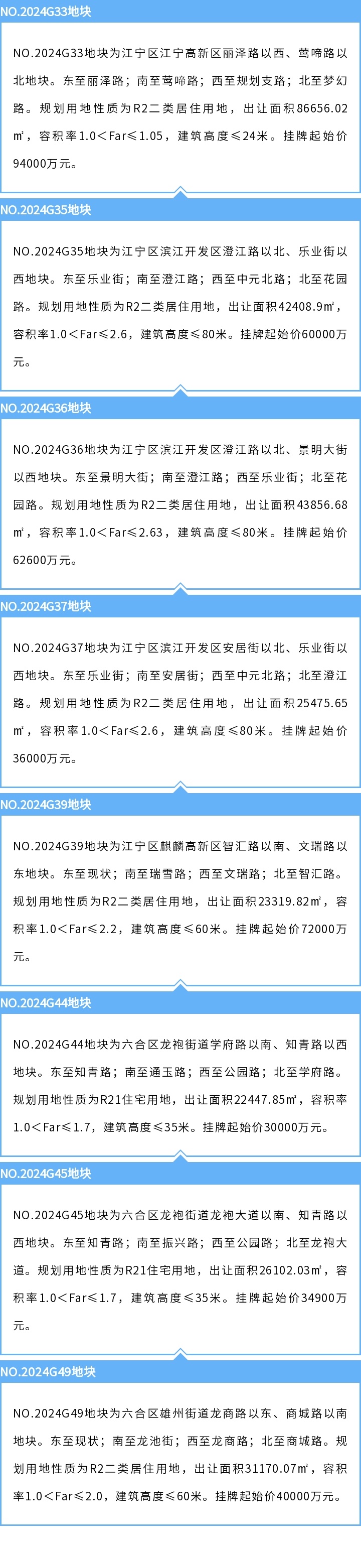 江寧G33地塊容積率為1.05,北側為方山風景區(qū),西側為上秦淮濕地,周邊有吉印大道、弘景大道、正方大道等主干道。G35、G36、G37這3幅地塊均位于江寧濱江開發(fā)區(qū),3幅地塊內所建地上計容房屋將全部由南京江寧濱江經濟開發(fā)區(qū)管理委員會(或其指定單位)定購,地上計容房屋定購包干價格為13772元/平方米。G39地塊位于麒麟科創(chuàng)園,西側靠近麒麟生態(tài)中央公園,東側緊鄰上壩河濱河景觀帶。