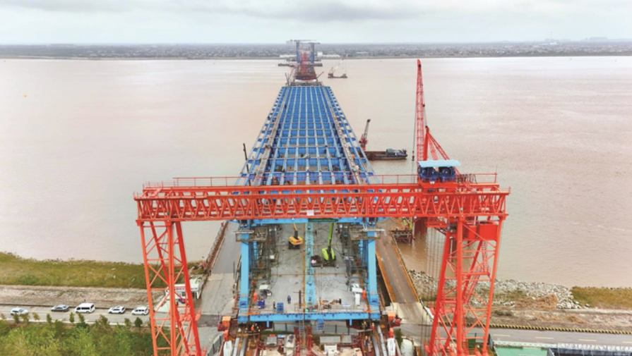 崇啟公鐵長江大橋是北沿江高鐵控制性節(jié)點(diǎn)工程,全長4.09公里,橫跨長江入??诒敝Ш降?。其構(gòu)造為雙層布置的公鐵兩用橋,上層為雙向6車道、時(shí)速100公里的一級(jí)公路,下層為時(shí)速350公里的雙線高速鐵路+時(shí)速250公里的雙線城際鐵路。大橋的主橋共有16個(gè)橋墩,分主航道和非通航孔。整個(gè)非通航孔鋼梁為主跨112米的雙層等高度連續(xù)鋼桁結(jié)合梁,由9節(jié)112米長的鋼梁及兩側(cè)各近100米長的鋼梁組合而成。鋼梁總重3.89萬噸,需分13輪連續(xù)頂推,預(yù)計(jì)明年下半年結(jié)束。