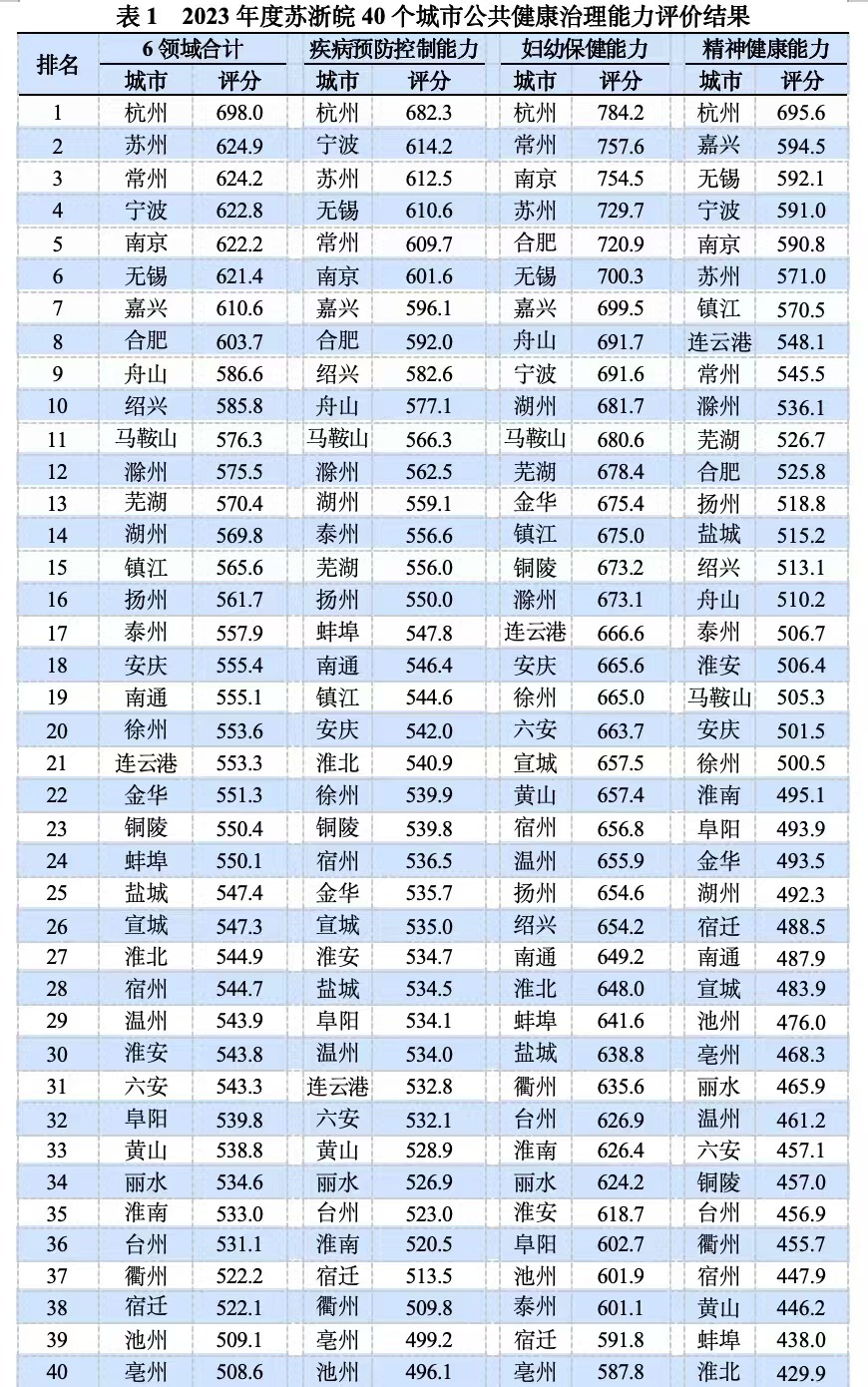 結(jié)果顯示,40座城市的公共健康治理能力綜合評分平均565.0分(滿分為1000分),杭州“領(lǐng)跑”,與蘇州、常州、寧波、南京共同位列前五。江蘇省13個(gè)設(shè)區(qū)市中,蘇州、常州、南京和無錫位列前四,泰州、宿遷和鎮(zhèn)江提升幅度位居前三。