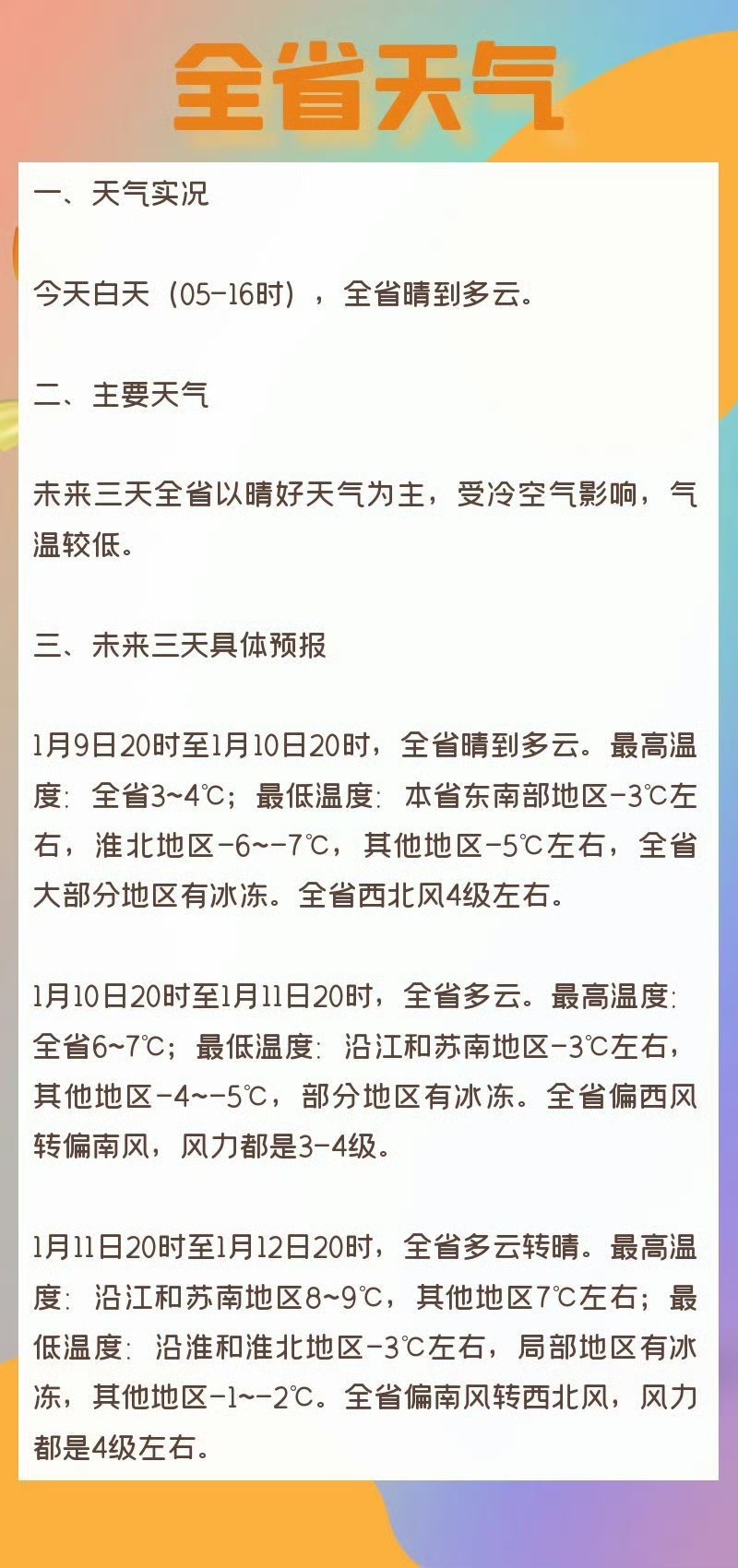 1月9日20時(shí)到1月10日20時(shí),全省晴到多云。最高溫度:全省3~4℃;最低溫度:本省東南部地區(qū)-3℃左右,淮北地區(qū)-6~-7℃,其他地區(qū)-5℃左右,全省大部分地區(qū)有冰凍。全省西北風(fēng)4級(jí)左右。