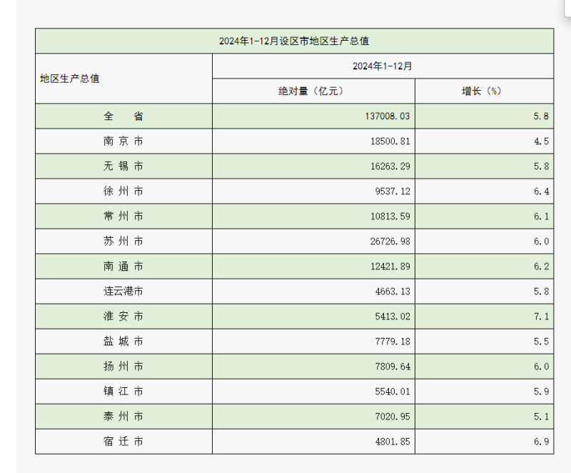 具體來看,2024年,蘇州、無錫、常州、南通、南京5個(gè)萬億級城市保持增長,帶動(dòng)全省GDP總量邁入13萬億新臺階;徐州GDP突破9500億元,正在向萬億級城市發(fā)起猛沖;揚(yáng)州、鹽城、泰州是3個(gè)7000億級的城市,“新晉7000億成員”泰州以7020.95億元的成績提前一年實(shí)現(xiàn)該市“十四五”目標(biāo);鎮(zhèn)江、淮安作為兩個(gè)5000億級的城市增速十分亮眼,尤其是淮安,以7.1%的成績摘得增速“桂冠”,領(lǐng)跑全?。凰捱w、連云港也達(dá)到了4000多億的體量,持續(xù)沖刺5000億目標(biāo)。