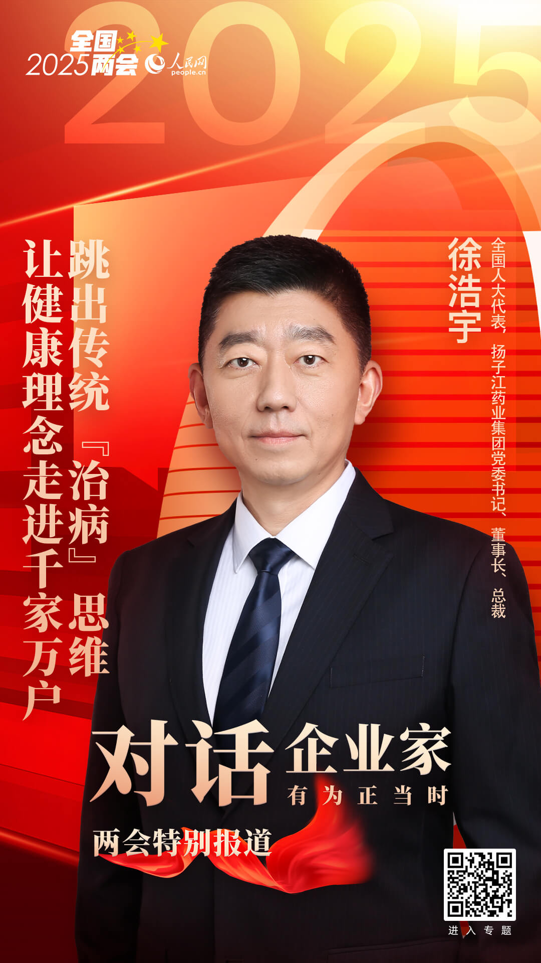 今年全國兩會期間,“健康管理”“體重管理年”等話題引發(fā)熱議?!皣掖罅Τ珜б匀嗣窠】禐橹行?,這就要求醫(yī)藥健康行業(yè)的企業(yè)家必須跳出‘治病’的傳統(tǒng)思維,一切發(fā)展都要以人民健康為中心,不僅要勇闖生物藥、基因治療等‘無人區(qū)’,也要關注老百姓的健康生活?!苯眨珖舜蟠?,揚子江藥業(yè)集團黨委書記、董事長、總裁徐浩宇在做客人民網(wǎng)《對話企業(yè)家》兩會特別節(jié)目時表示。
