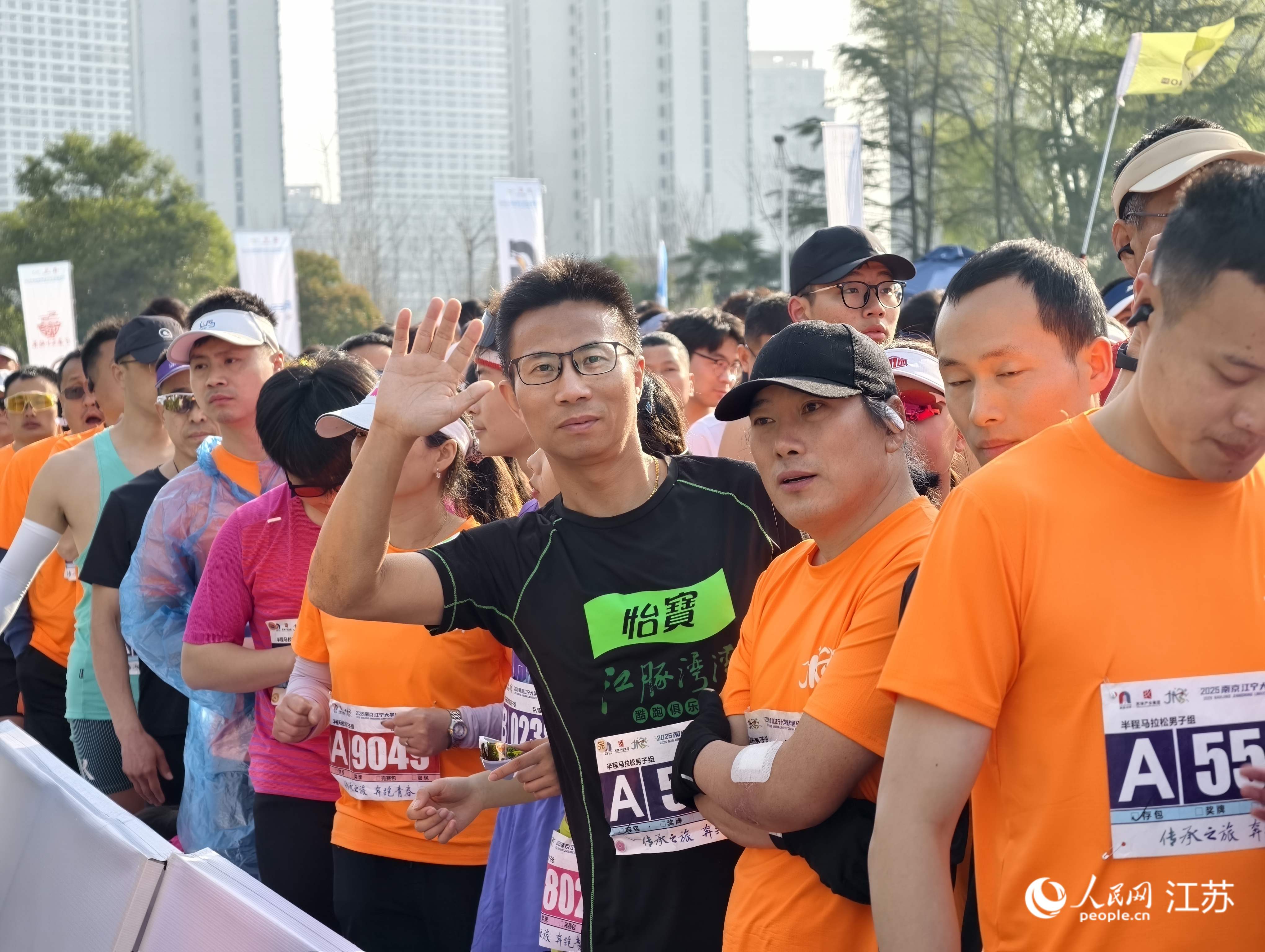 南京醫(yī)科大學(xué)第二附屬醫(yī)院醫(yī)生管敬(右四)等待開跑。人民網(wǎng)記者 馬曉波攝