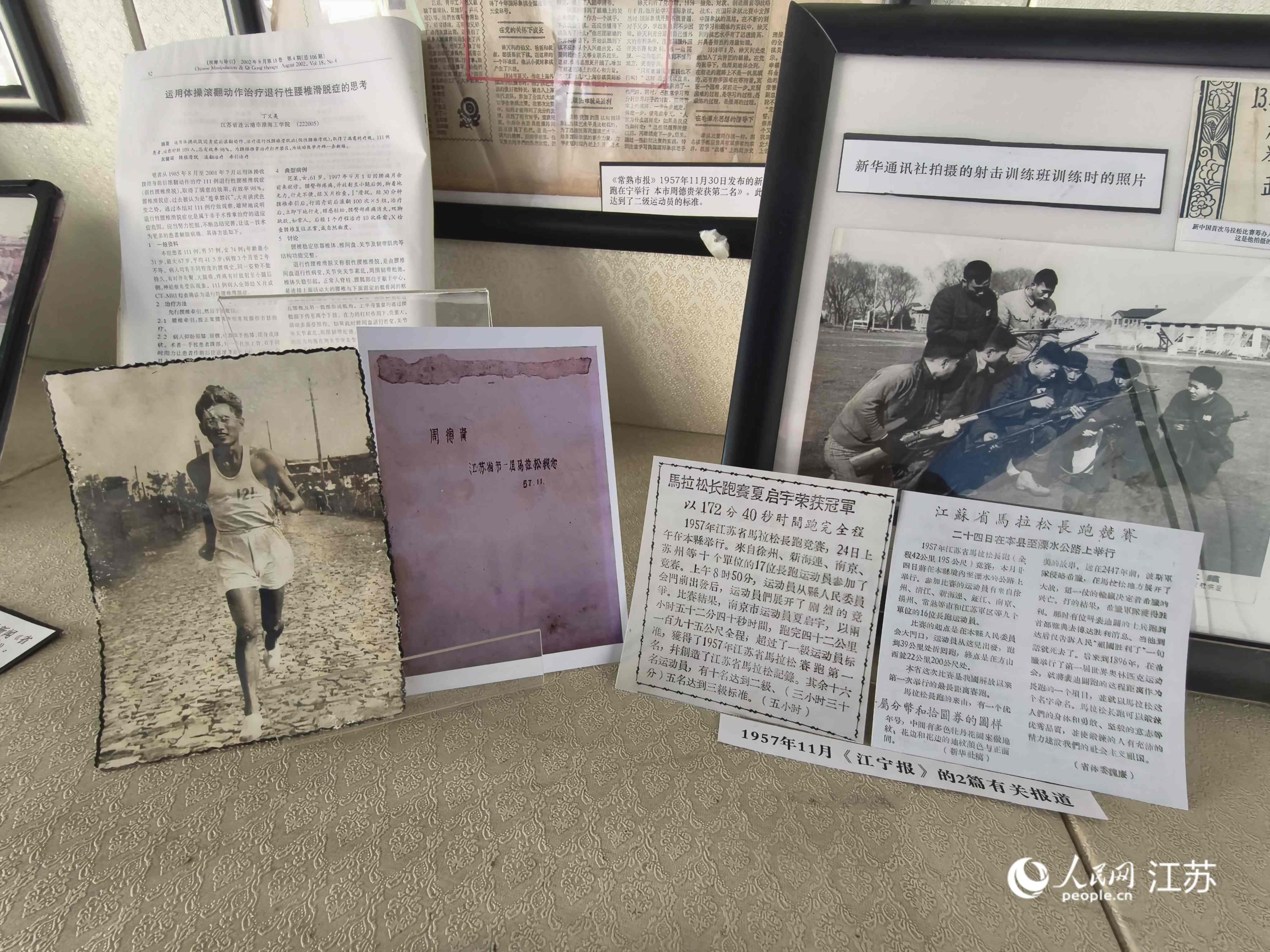 南航金城學(xué)院長距離競走工作室布設(shè)的新中國首馬文獻展示區(qū)。人民網(wǎng)記者 馬曉波攝