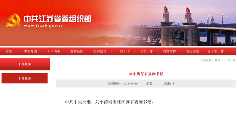 中共中央批準(zhǔn):劉小濤同志任江蘇省委副書記。