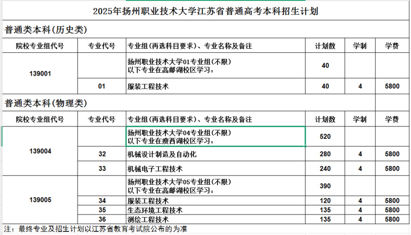 揚(yáng)州職業(yè)技術(shù)大學(xué)今年首批設(shè)置機(jī)械設(shè)計(jì)制造及自動化、機(jī)械電子工程技術(shù)、服裝工程技術(shù)、生態(tài)環(huán)境工程技術(shù)、測繪工程技術(shù)等5個職業(yè)本科專業(yè),共招生950人,全部面向江蘇省內(nèi)。其中,910個招生計(jì)劃面向物理類考生,40個招生計(jì)劃面向歷史類考生。