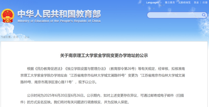教育部發(fā)布公示 南京一高校擬變更辦學(xué)地址