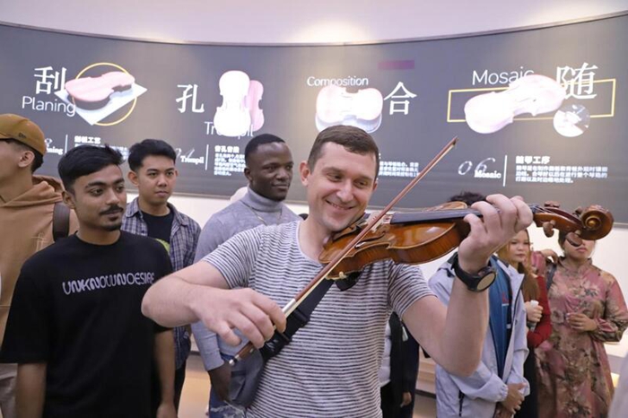 “能讓我試試嗎?”印尼的艾迪森舉著琴弓躍躍欲試。在樂手指導下,他和同伴們用小提琴拉出了《泰州泰美 泰想你來》《銀杏飄香的地方》等曲目的片段,盡管手法生澀,卻贏得周圍陣陣掌聲,伴著動感的旋律,不少外籍友人情不自禁地載歌載舞起來,現(xiàn)場化作了歡樂的海洋?!敖裉斓难莩龊芫?,黃橋先進的樂器工藝和濃厚的音樂氛圍讓我記憶深刻!”德國的馬丁由衷說道。