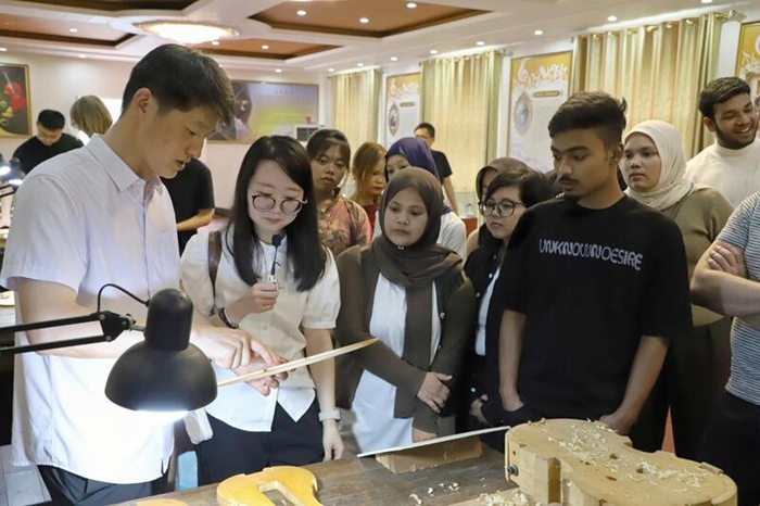 “原來琴身這么薄,制作起來可太難了!”喀麥隆的龍斯捏著打磨好的琴板,眼神里滿是驚嘆。一旁來自印尼的羅莎則屏住呼吸,用刻刀在琴板上輕輕刻下一道音孔弧線,盡管痕跡還有些歪斜,但她仍興奮地表示:“這是我親手做的——世界上‘最獨一無二’的小提琴!”