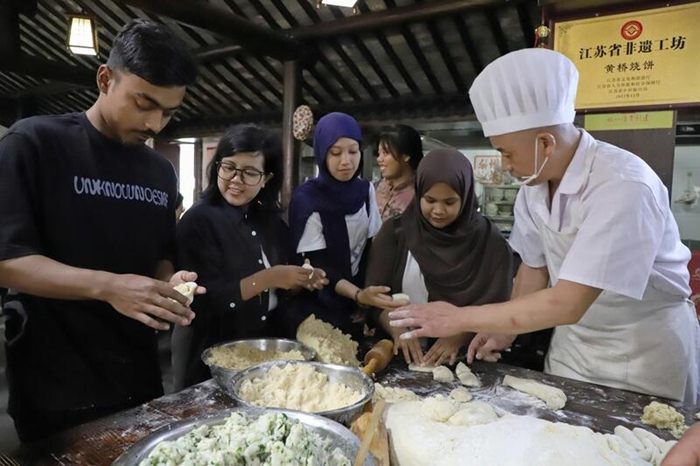 “咱們這燒餅講究‘兩面黃、外撒芝麻、內(nèi)擦酥’,面粉、芝麻、豬油都是本地產(chǎn)的,特別香!”師傅們邊說邊示范,引得大家爭相體驗?!霸谖覀儑?,很少有機會邊做食物邊聊天,這種熱鬧特別親切。”俄羅斯的伊萬捧著剛出爐的燒餅咬下第一口后頓時豎起了大拇指:“外脆里酥,口感豐富,這是我第一次親手制作燒餅,這里面有故事、有手藝,還有這么多人的情感和心意,我會牢牢記在心里!”