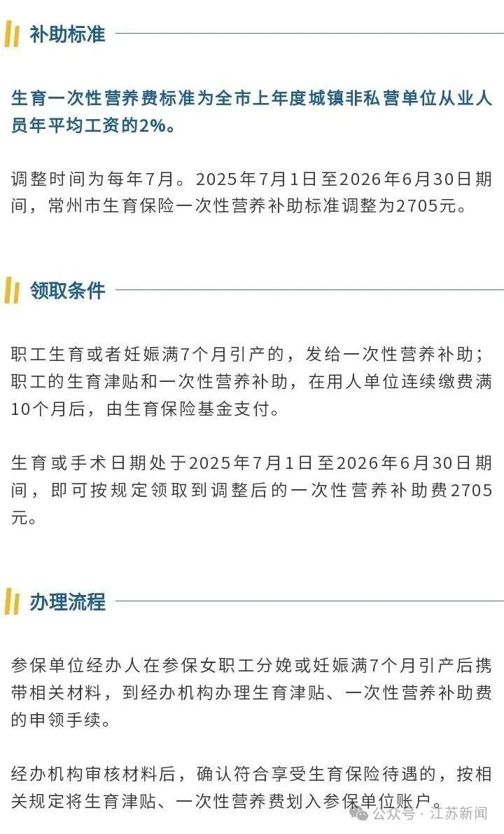 根據(jù)《江蘇省職工生育保險(xiǎn)規(guī)定》等文件精神,結(jié)合常州市實(shí)際,2025年7月1日至2026年6月30日期間,全市女職工生育一次性營(yíng)養(yǎng)補(bǔ)助費(fèi)計(jì)發(fā)標(biāo)準(zhǔn)調(diào)整至2705元。