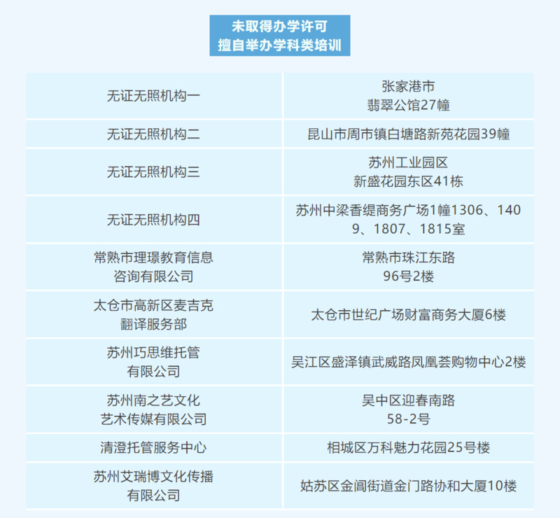 【蘇州】10家機(jī)構(gòu)未取得辦學(xué)許可擅自舉辦學(xué)科類培訓(xùn)