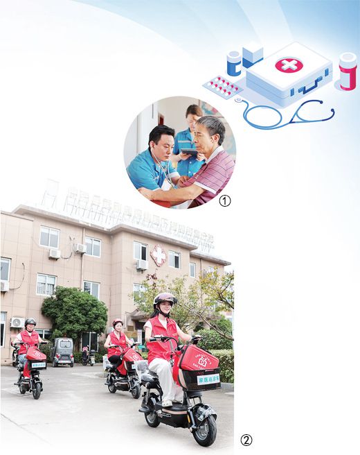 圖②:今年9月,浙江湖州市德清縣下渚湖街道社區(qū)衛(wèi)生服務(wù)中心,由街道商會贈送的11輛家庭醫(yī)生巡診電動自行車正式投入使用。圖為家庭醫(yī)生騎著巡診電動自行車準(zhǔn)備上門為居民提供健康服務(wù)。蔡 俊攝(人民視覺)