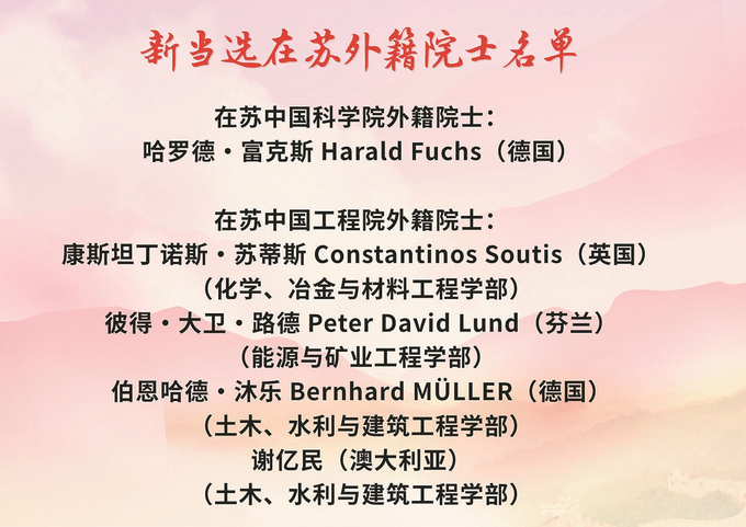 11月21日,中國科學(xué)院、中國工程院公布2025年院士增選結(jié)果。73位新當(dāng)選中國科學(xué)院院士中,人事關(guān)系在蘇院士有6位;71位新當(dāng)選中國工程院院士中,人事關(guān)系在蘇院士有兩位。此次增選后,在蘇兩院院士達(dá)122人,總數(shù)位居全國第三。此外,兩院新增51位外籍院士中有5位在蘇。