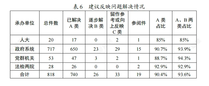 今年的818件建議中,教科文衛(wèi)體和旅游方面的建議數(shù)量最多,為216件,發(fā)展規(guī)劃、交通運輸和綜合經(jīng)濟204件,民政公安、勞動人事、社保126件緊隨其后。除19件不具備辦理條件的傳作為參閱件,740件已經(jīng)解決,26件三年內(nèi)逐步解決,33件留作參考或向上級反映,辦成率突破90%,提升到90.4%。
