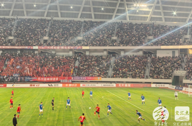 11月29日晚,第二屆江蘇省足球發(fā)展重點城市對抗賽次回合在蘇州奧體中心體育場燃情開賽。經過激烈的角逐,蘇州隊在次回合以比分0∶1惜敗南京隊,最終以兩回合總比分3∶1成功衛(wèi)冕“雙城賽”冠軍。現場41632名球迷共同見證了江蘇足球的榮耀時刻。