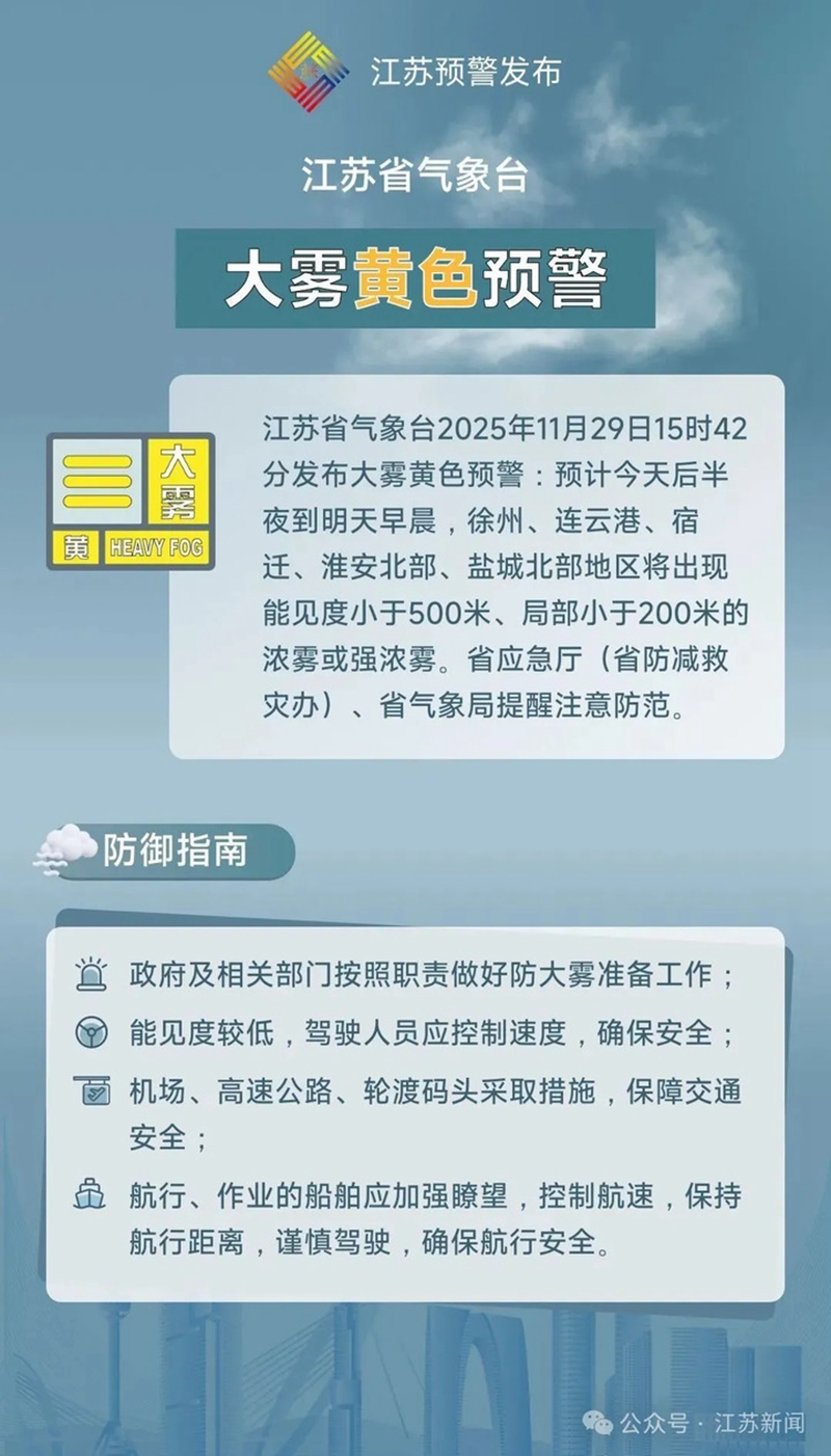 江蘇省氣象臺(tái)11月29日15時(shí)42分發(fā)布大霧黃色預(yù)警:預(yù)計(jì)今天后半夜到明天早晨,徐州、連云港、宿遷、淮安北部、鹽城北部地區(qū)將出現(xiàn)能見度小于500米、局部小于200米的濃霧或強(qiáng)濃霧。省應(yīng)急廳(省防減救災(zāi)辦)、省氣象局提醒注意防范。