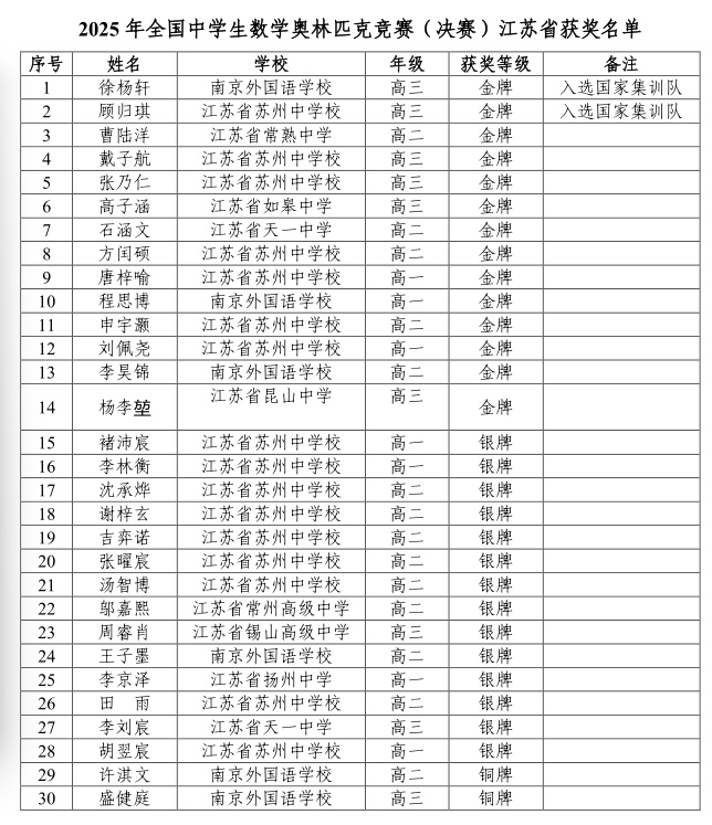 據(jù)了解,江蘇省共派出30名學(xué)生參加2025年全國(guó)中學(xué)生數(shù)學(xué)奧林匹克競(jìng)賽決賽,14人獲得金牌,14人獲得銀牌,2人獲得銅牌,具體名單如下: