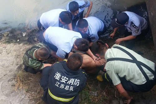 與同事在排污河中控制住一精神狂燥男子