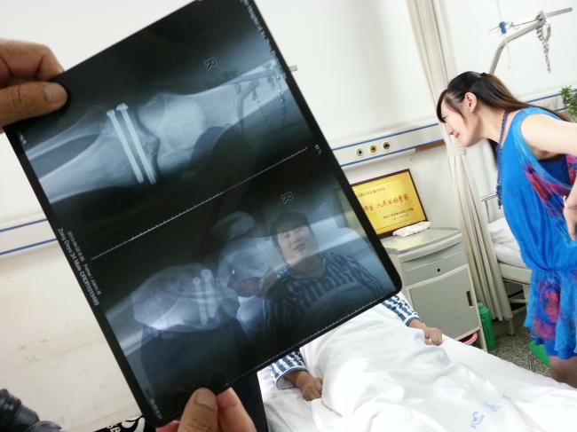 次日凌晨3時(shí),長(zhǎng)達(dá)5個(gè)小時(shí)的手術(shù)結(jié)束。由于膝蓋骨碎了,醫(yī)生從宗德宇的胯骨處取下一塊骨頭,把膝蓋骨撐了起來(lái)!皟筛蜻M(jìn)腿骨的釘子要一年后再次手術(shù)才能取出!辈》坷铮诘掠75歲的父親拿著X光片告訴記者,因?yàn)閮鹤庸室怆[瞞,他和老伴是兩天后從報(bào)紙上才知道消息的。