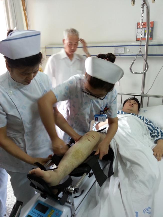 宗德宇拿掉鑰匙、手機(jī)等能發(fā)出聲響的物品,從一側(cè)緩緩靠近。正當(dāng)宗德宇準(zhǔn)備翻越矮墻時(shí),女子眼角余光瞄到了他。女子一聲尖叫,準(zhǔn)備跳樓。宗德宇縱身躍過(guò)矮墻,一把將女子攬了過(guò)來(lái)。為了保護(hù)對(duì)方落地時(shí)不受傷,宗德宇的右臂、右腿撞到水泥墻上。女子安然無(wú)恙,宗德宇卻右腿脛骨平臺(tái)骨折、右腓骨小頭骨折、右髁間山脊粉碎骨折、腿部肌腱撕裂及右手臂多處擦傷,必須立即手術(shù)。