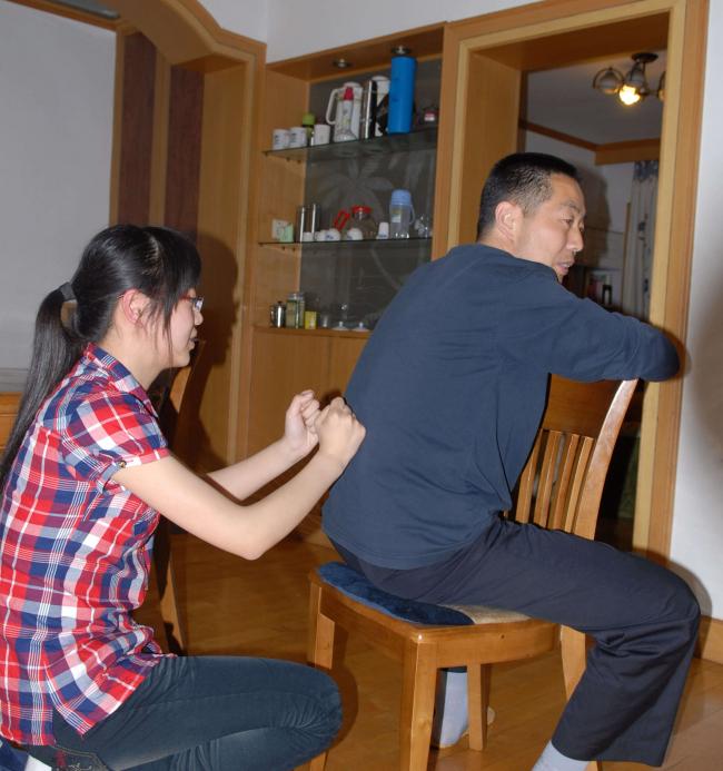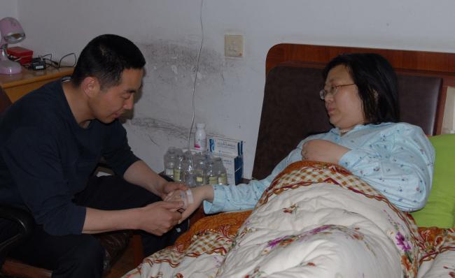 劉光兵親自為患病的妻子掛點(diǎn)滴