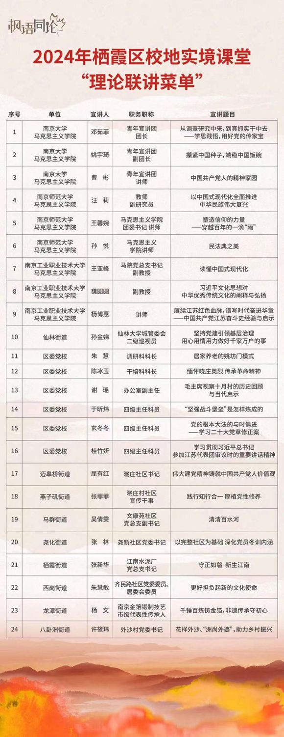 為深入學習貫徹習近平新時代中國特色社會主義思想和黨的二十大精神,充分發(fā)揮駐區(qū)高校思政資源優(yōu)勢,推進實境課堂建設,提高冬訓學習成效,4月17日,校地聯動 “棲”待“理”來——南京市棲霞區(qū)黨員冬訓實境課堂展示交流活動暨冬訓工作經驗總結會舉辦。 現場舉辦了棲霞區(qū)校地實境課堂“理論聯講菜…